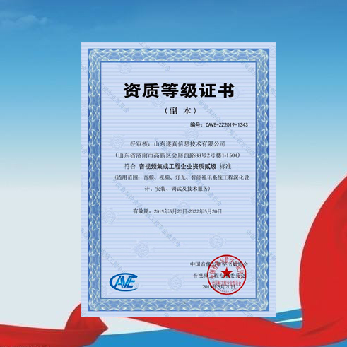 公司獲得中國音像協(xié)會(huì)音視頻工程專業(yè)委員會(huì)頒發(fā)的《音視頻集成工程企業(yè)資質(zhì)貳級(jí)》證書,成為省內(nèi)首批通過該權(quán)威機(jī)構(gòu)認(rèn)證的二級(jí)資質(zhì)企業(yè)。